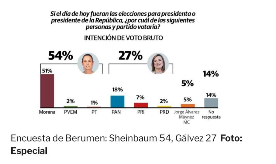 Así lo mostraron los resultados del Estudio Preelectoral a Nivel Nacional para la Presidencia de la República, elaborado por Berumen, con fecha de levantamiento de encuestas entre el 31 de enero y el 7 de febrero del 2024.