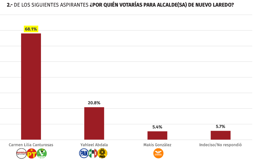El documento revelado éste miércoles, y sustraido de 1 mil 200 entrevistas realizadas a habitantes de esa ciudad fronteriza, incluye indicadores que apuntan, además, que en la segunda posición marcha la candidata de la Oposición Yahleel Abdalá con 20.8%.