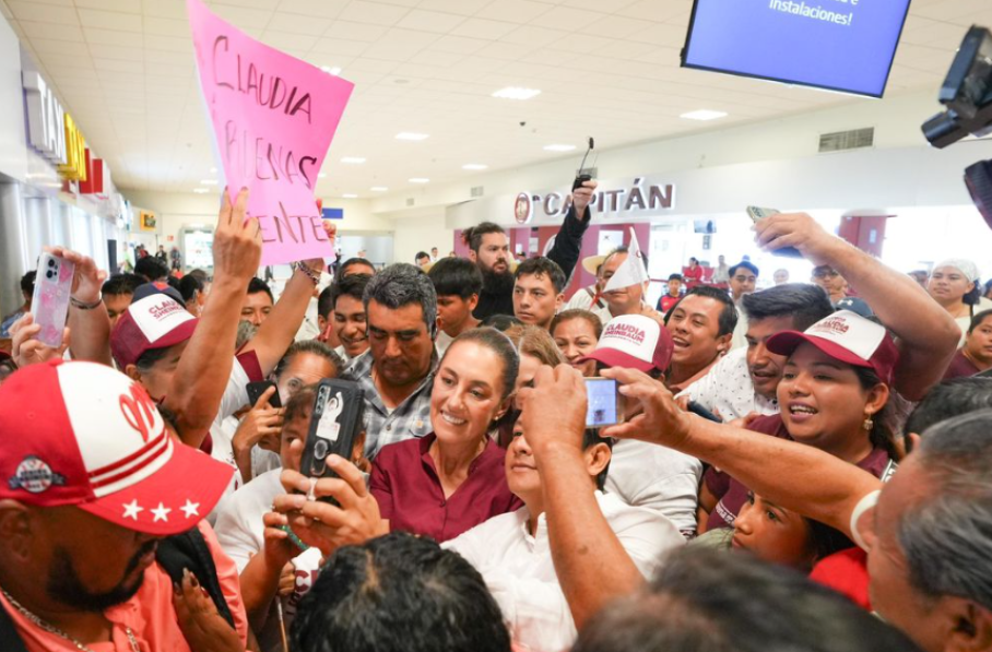 Villahermosa, Tabasco.- Con porras y abrazos, Claudia Sheinbaum, candidata a la Presidencia de México por la Coalición “Sigamos Haciendo Historia” (Morena-PT-PVEM), llegó al Aeropuerto Internacional de Villahermosa, Tabasco, donde le dieron la bienvenida cientos de militantes y simpatizantes, entre los que se destacaron grupos de mujeres y jóvenes.