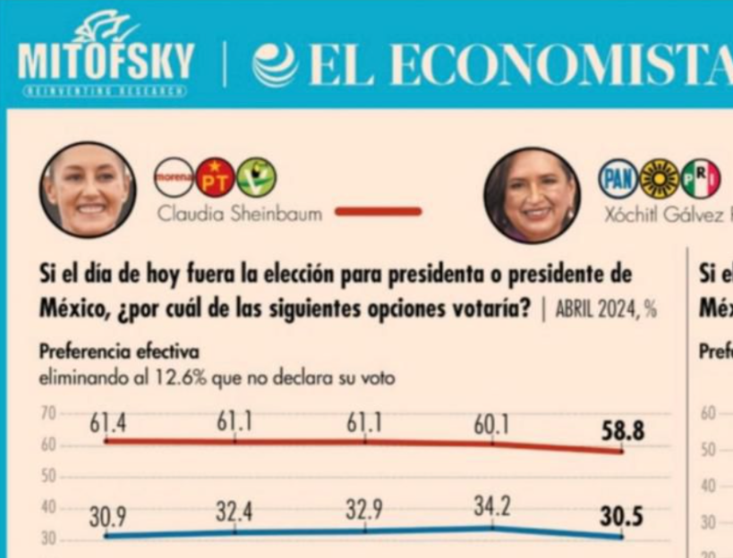 La encuesta nacional Mitofsky Tendencias electorales rumbo al 2 de junio 2024, realizada para El Economista, revela que según la preferencia efectiva, que elimina a los entrevistados que no declararon el sentido de su voto (12.6%), las candidatas presidenciales de Morena, PT y PVEM y del PAN, PRI y PRD registraron una caída en abril, respecto del mes previo, de 1.3 y 3.7%, respectivamente, mientras que Álvarez Máynez subió 4.9 puntos en el mismo lapso.
