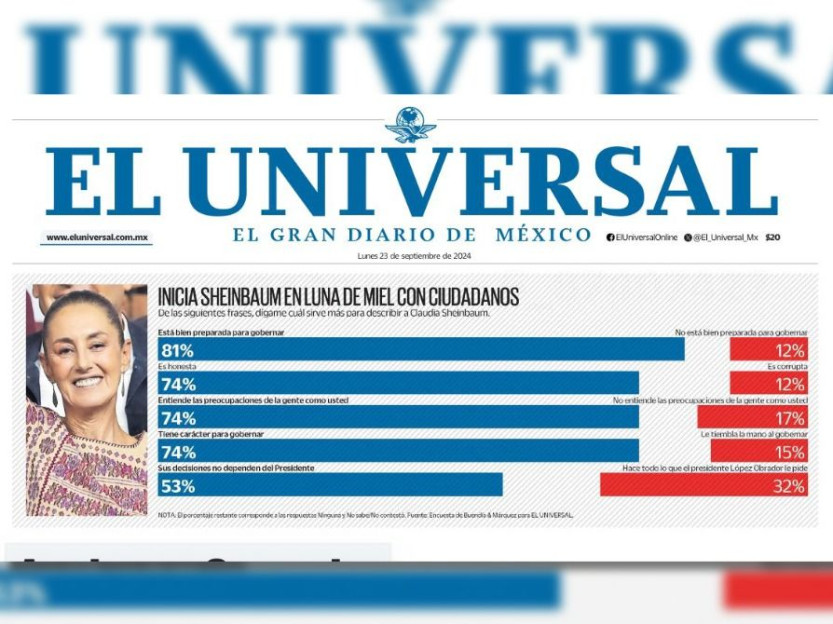 Un trabajo de medición presentado éste lunes por el periódico El Universal, a una semana de iniciar nuevo sexenio, arroja que Claudia Sheinbaum llega a esta instancia con la certeza del 81% de mexicanos en su capacidad para gobernar.