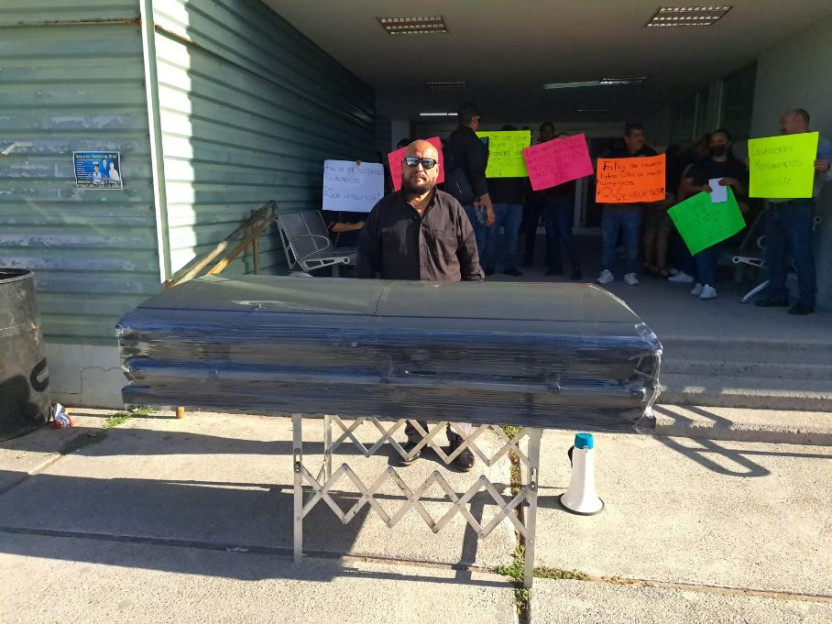 El grupo de maestros acudieron en las afueras de las instalaciones donde denunciaron que no hay medicamento; no se cuenta con especialistas; tienen más de un año sin quirófano y no hay servicios en días festivos.