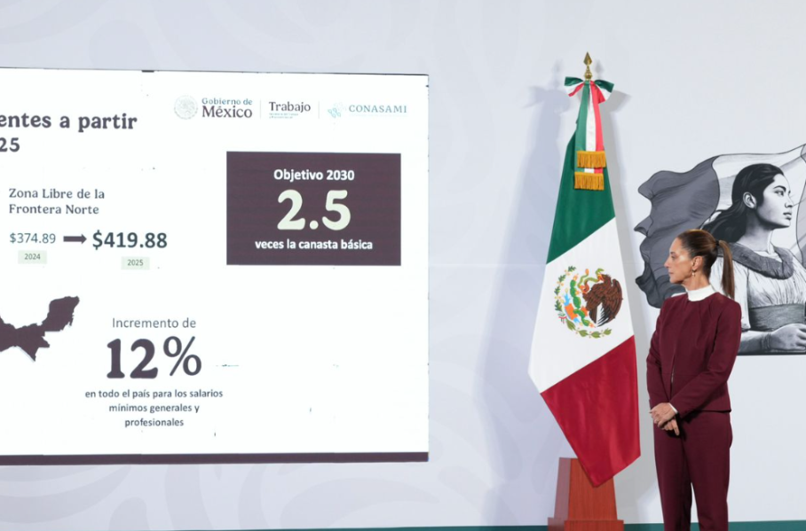 La Presidenta de México, Claudia Sheinbaum Pardo, anunció que tras un buen acuerdo con el sector empresarial, el salario mínimo para el 2025 tendrá un incremento de 12 por ciento en todo el país, ya que pasará de 248.93 pesos a 278.80 pesos diarios; mientras que para zona de la frontera será pasará de 374.89 a 419.88 pesos.
