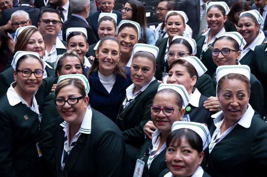 Durante su mensaje, la Jefa del Ejecutivo Federal reconoció de manera muy especial a todas las mujeres trabajadoras del IMSS, quienes además de atender a las y los derechohabientes también laboran en sus hogares para fortalecer a sus familias.