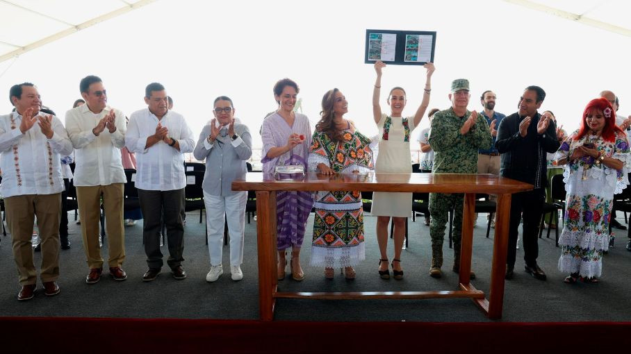 Acompañaron a la Presidenta de México, el secretario de la Defensa Nacional, general Ricardo Trevilla Trejo; la secretaria de Gobernación, Rosa Icela Rodríguez; el secretario de Infraestructura, Comunicaciones y Transportes, Jesús Antonio Esteva Medina; la secretaria de Desarrollo Agrario, Territorial y Urbano, Edna Elena Vega Rangel; la secretaria de Anticorrupción y Buen Gobierno, Raquel Buenrostro Sánchez; la secretaria de Turismo, Josefina Rodríguez Zamora y el director general del Instituto Nacional de Antropología e Historia (INAH), Diego Prieto Hernández.Las y los gobernadores de Chiapas, Eduardo Ramírez Aguilar; de Campeche, Layda Sansores San Román; de Tabasco, Javier May Rodríguez y de Yucatán, Joaquín Díaz Mena, así como la presidenta municipal de Othón P. Blanco, Yensunni Idalia Martínez Hernández.