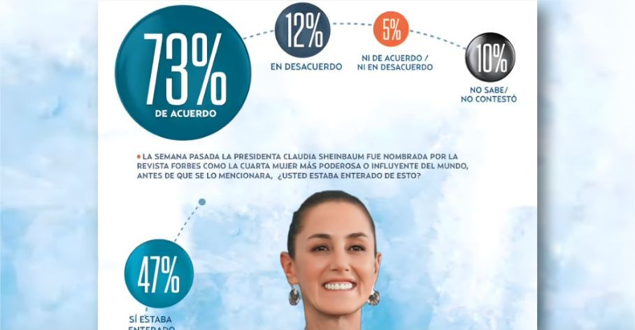A la pregunta: “¿Está usted de acuerdo o en desacuerdo con el nombramiento dado a la presidenta Claudia Sheinbaum por parte de la revista Forbes?”, el 73% respondió que está “de acuerdo”; 12% “en desacuerdo”; 5%“nideacuerdo,niendesacuerdo” y 10% “no sabe/no contestó”.