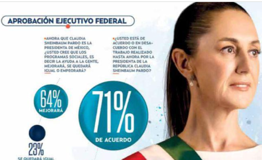 A la pregunta de “¿Usted está de acuerdo o en desacuerdo con el trabajo realizado hasta ahora por la presidenta de la República Claudia Sheinbaum Pardo?”, 71 por ciento respondió “de acuerdo”, 11 por ciento dijo “en desacuerdo”, 8 por ciento, “ni de acuerdo ni en desacuerdo” y 10 por ciento “no sabe/no contestó”.