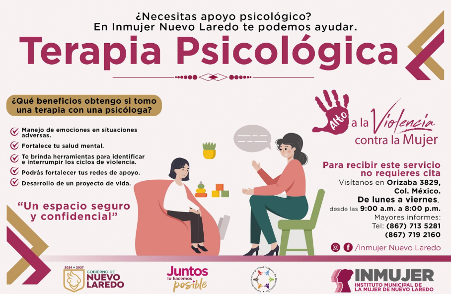 El Instituto Municipal de la Mujer de Nuevo Laredo y el Gobierno Municipal comprometidos con la salud mental y emocional de las neolaredenses ponen a disposición terapias psicológicas que las ayudarán para un mejor desarrollo físico y mental.
