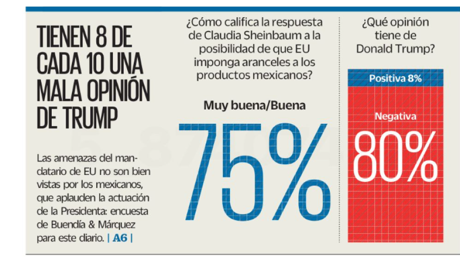 La encuesta también indica que 75% de la población evalúa como “muy buena” o “buena” la respuesta de Sheinbaum Pardo ante la amenaza de imponer aranceles a las exportaciones mexicanas, mientras que 13% la califica como “mala” o “muy mala”.eakiza