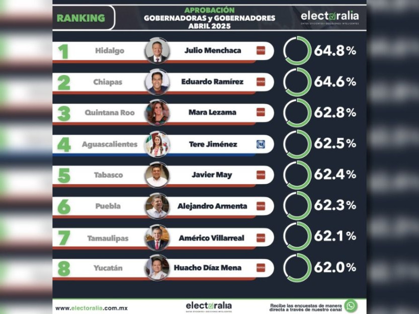 Un estudio reealizado por la Consultora Electoralia coloca al gobernador de Tamaulipas, Américo Villarreal Anaya en séptima posición en una medición nacional sobre los mandatarios estatales mejor avalados por sus ciudadanos correspondiente al mes de abril.