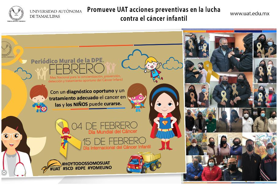 La Universidad Autónoma de Tamaulipas (UAT) colabora con la Secretaría de Salud del Gobierno del Estado en la promoción del Mes Nacional para la Concientización, Prevención, Detección y Tratamiento oportuno del Cáncer Infantil, que tiene como lema “Detectar hoy para sonreír mañana”.