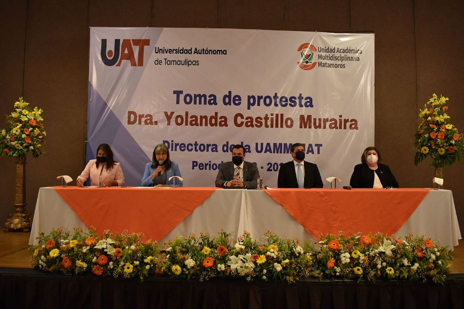El Rector de la Universidad Autónoma de Tamaulipas (UAT), C. P. Guillermo Mendoza Cavazos, encabezó la ceremonia de toma de protesta de la Dra. Yolanda Castillo Muraira, como Directora de la Unidad Académica Multidisciplinaria Matamoros (UAMM) para el período 2022-2026.