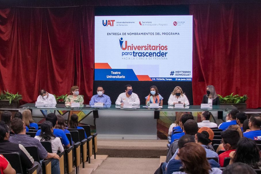 El C. P. Guillermo Mendoza Cavazos, Rector de la Universidad Autónoma de Tamaulipas (UAT), presidió la ceremonia de entrega de nombramientos a cincuenta y un estudiantes de nivel medio superior, superior y de posgrado de esta casa de estudios que integran la primera generación del programa Universitarios para Trascender.