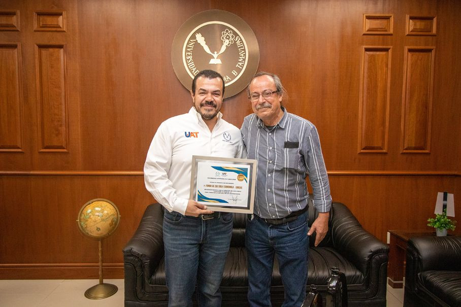 El C.P. Guillermo Mendoza Cavazos, Rector de la Universidad Autónoma de Tamaulipas (UAT) entregó un reconocimiento a Fritz Glockner, Director General de la red nacional de librerías Educal, por el apoyo a las estrategias de promoción a la lectura entre la comunidad estudiantil.