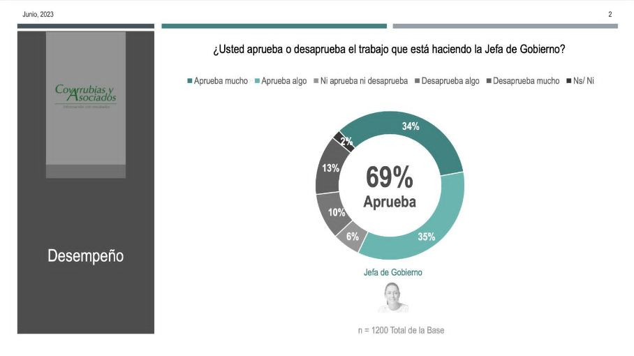 CDMX.- Según la Encuesta de Gestión Gubernamental CDMX, junio 2023, publicada por Covarrubias y Asociados, un 69% de los capitalinos aprueba la gestión de Claudia Sheinbaum al frente de la capital del país.