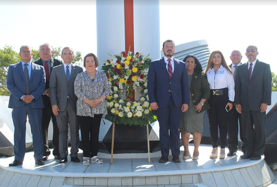 Como parte del protocolo, el C. P. Guillermo Mendoza Cavazos realizó la guardia de honor y colocó una ofrenda floral, acompañado de la Mtra. Elda Ruth de los Reyes Villarreal, directora de la Facultad de Derecho y Ciencias Sociales (FADYCS); y del Dr. Raúl de León Escobedo, director de la Facultad de Medicina de Tampico.