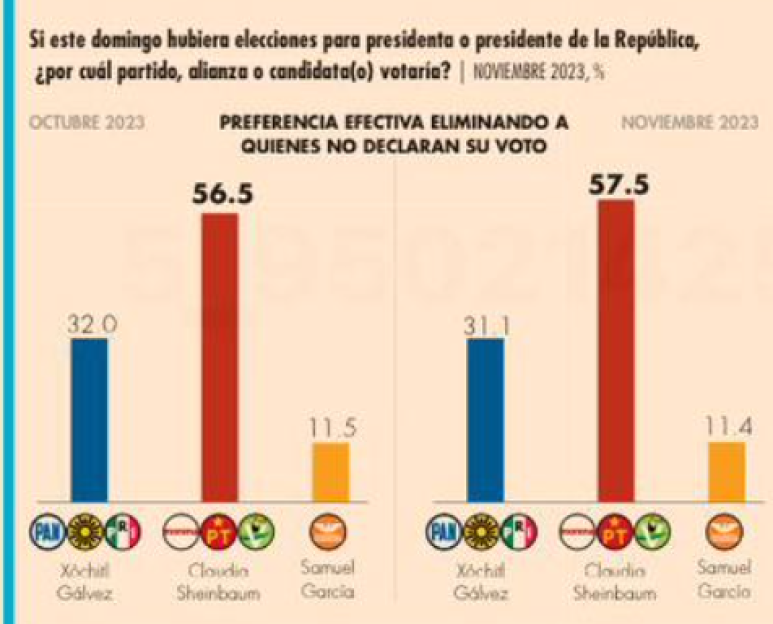En el seguimientio de esta carrera, Mitofsky recuerda que en su estudio del mes de octubre, Sheinbaum acumulaba un 56.5% por lo que en un mes logró registrar un punto adicional en tanto que Xóchitl Gálvez tenía un 32% por lo que perdió un punto en 30 dias.
