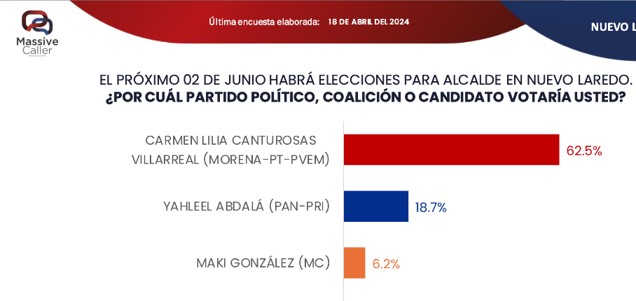 Con una superioridad manifiesta de 62.5 % en Intención de Voto, la candidata de la Coalición 'Sigamos Haciendo Historia' Carmen Lilia Canturosas marcha al frente de las preferencias electorales en ruto a la Elección Municipal de Nuevo Laredo para el próximo 2 de junio.