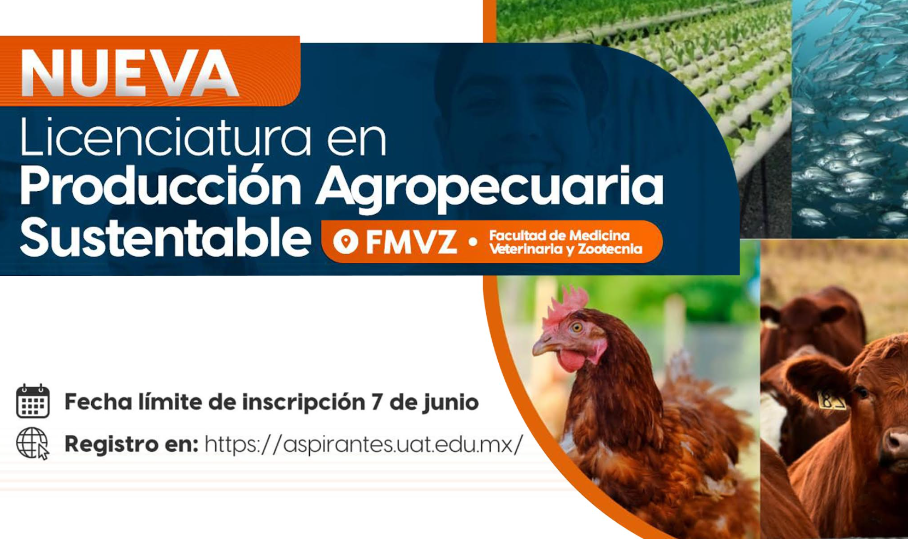 La Universidad Autónoma de Tamaulipas ofrece para el próximo ciclo escolar universitario 2024-3 (periodo de otoño) la nueva Licenciatura en Producción Agropecuaria Sustentable, que impartirá la Facultad de Medicina Veterinaria y Zootecnia Dr. Norberto Treviño Zapata (FMVZ UAT).