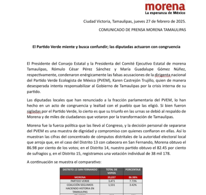 Morena fue la fuerza política que las llevó al Congreso, y la decisión personal de separarse del PVEM es una muestra de dignidad y compromiso con quienes confiaron en ellas. Así lo muestran las cifras del concentrado de cómputos distritales de la autoridad electoral local que arroja que, en el caso del Distrito 13 con cabecera en San Fernando, Morena obtuvo el 86.98 por ciento de los votos; en el Distrito 14, nuestro partido obtuvo el 82.45 por ciento de sufragios y, en el Distrito 15, registramos una votación individual de 38 mil 178.
