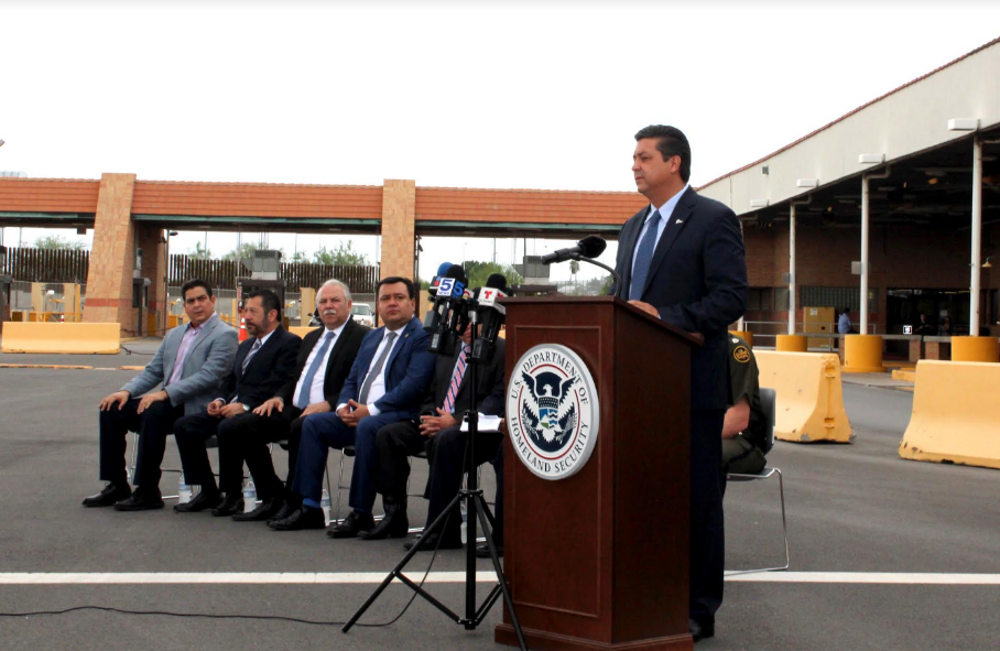 La conferencia de prensa tuvo lugar en una de las áreas de estacionamiento del puente internacional en la ciudad de Hidalgo.