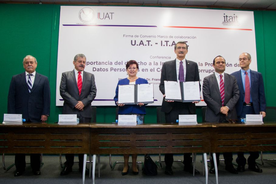Teniendo como testigo de honor al Dr. Acuña Llamas, el Rector y la Presidenta del ITAIT firmaron el convenio, que por tercera vez se celebra para impulsar acciones conjuntas de investigación, docencia, difusión y extensión de la cultura de la transparencia, acceso a la información pública y protección de datos personales.