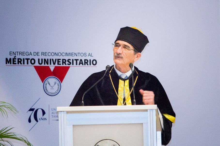 En Asamblea Solemne, el Rector José Andrés Suárez Fernández encabezó la ceremonia de Reconocimiento al Mérito Universitario, máxima distinción que otorga la Universidad Autónoma de Tamaulipas (UAT) a profesores y trabajadores sindicalizados por su trayectoria en la casa de estudios; a los estudiantes de excelencia; a las mejores tesis de licenciatura y posgrado; y a sus investigadores.