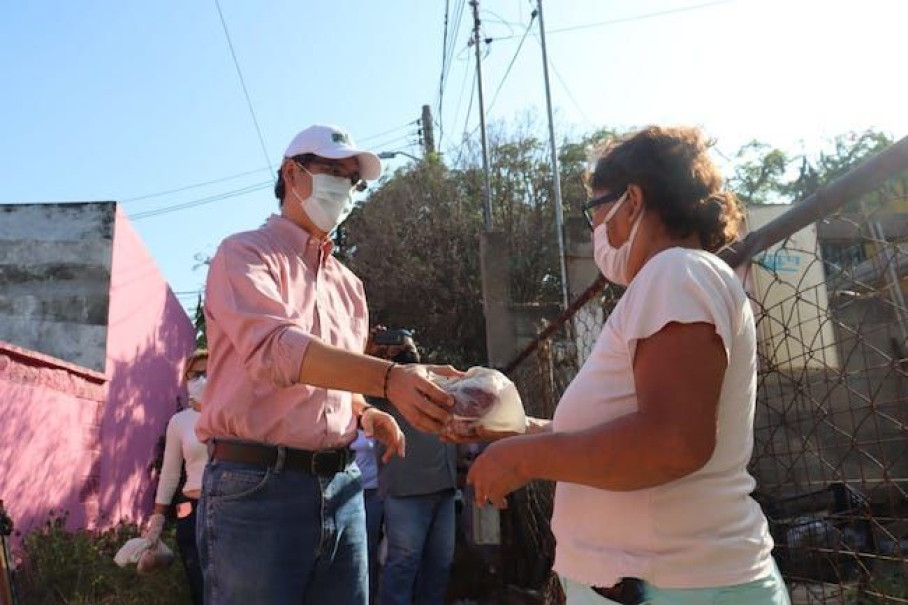 Este lunes llegó a la Colonia Puerto Alegre situado en la zona norte de Ciudad Madero, donde entregó carne y quesos a familias que se han visto afectadas económicamente por los efectos de la pandemia del Covid-19.