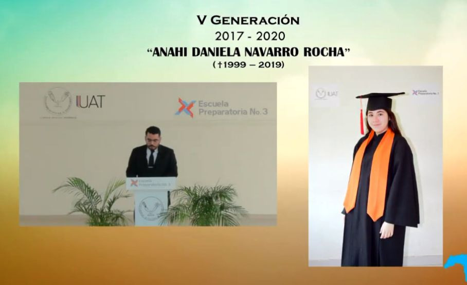 La Generación 2017-2020 lleva el nombre de la alumna Anahí Daniela Navarro Rocha (+) 1999-2019, quien acompañó a los egresados hasta el segundo año de preparatoria, caracterizándose por su esfuerzo, dedicación, compañerismo y amor a su escuela.