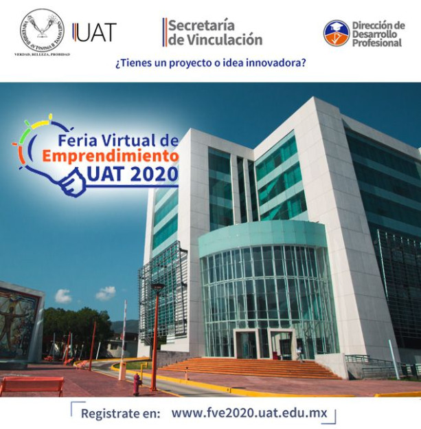 La Universidad Autónoma de Tamaulipas a través de la Secretaría de Vinculación yla Dirección de Desarrollo Profesional, organiza la Feria Virtual de Emprendimiento UAT2020, que se llevará a cabo durante los días 10 y 11 de noviembre.