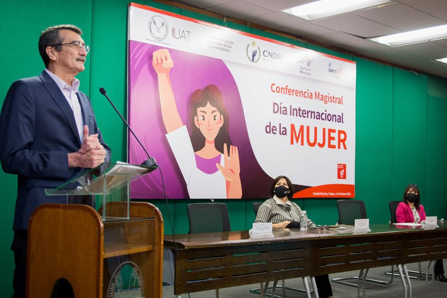 Durante su mensaje inaugural de la conferencia organizada por la Defensoría de los Derechos de los Universitarios de la UAT, el Rector reiteró el respeto, respaldo y admiración a las mujeres.
